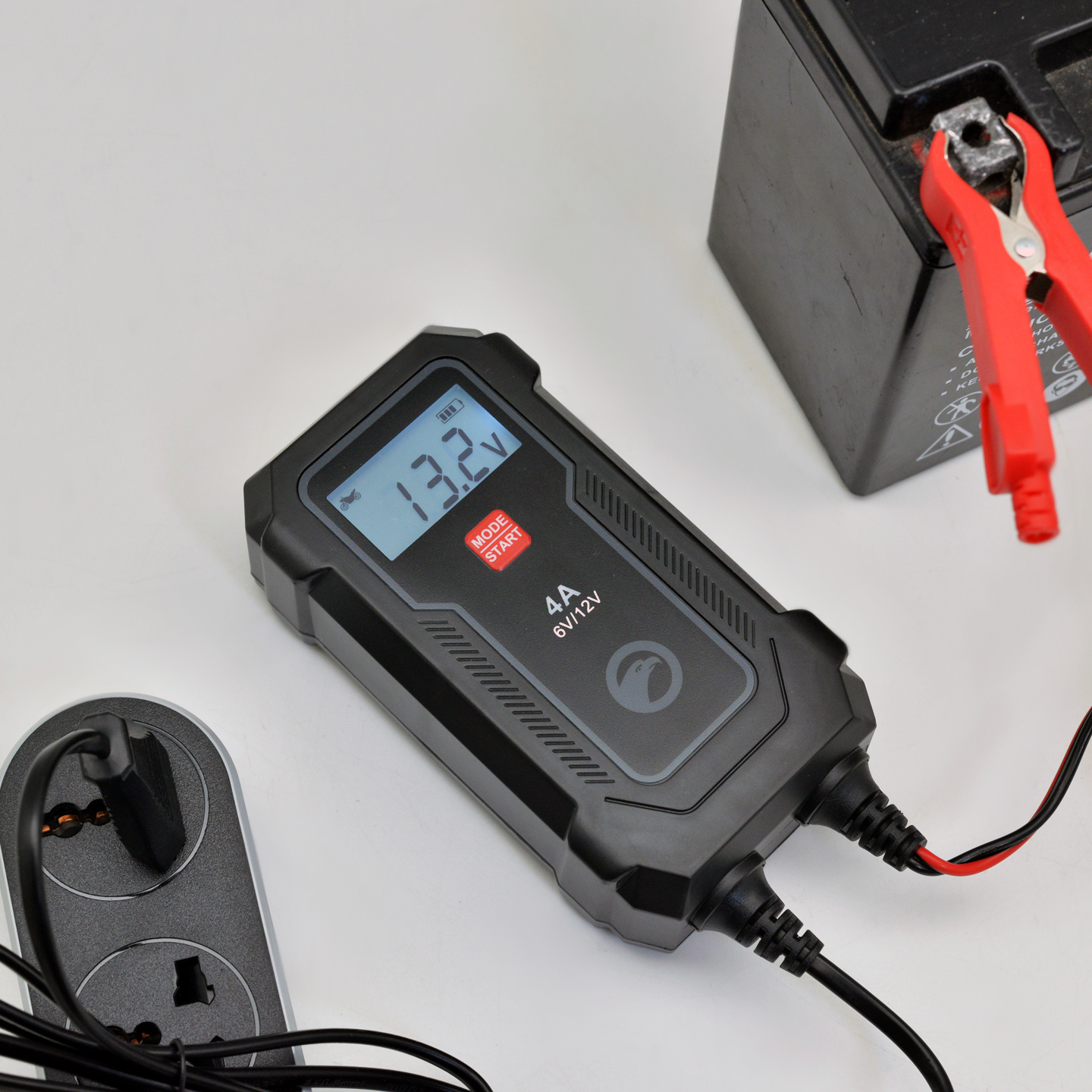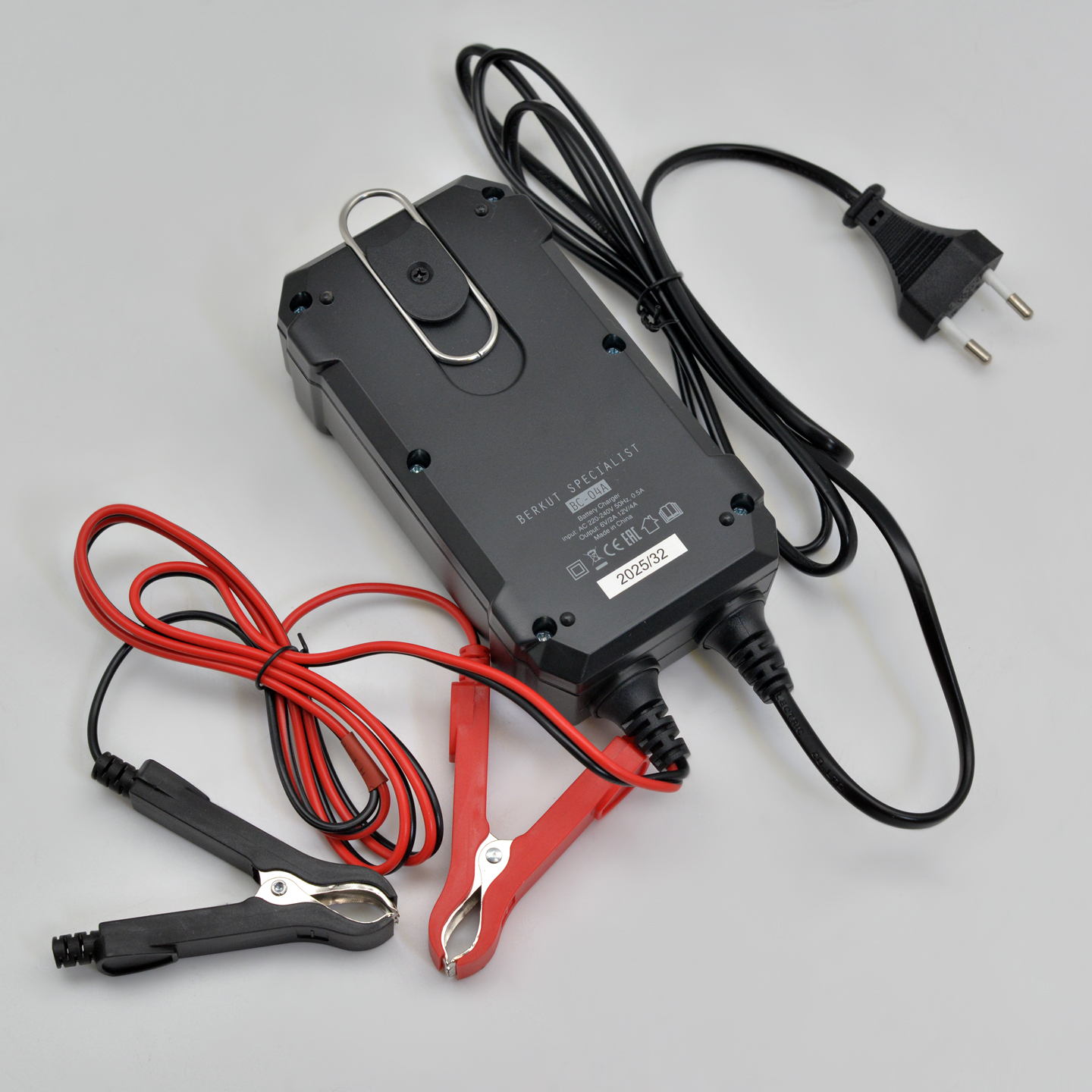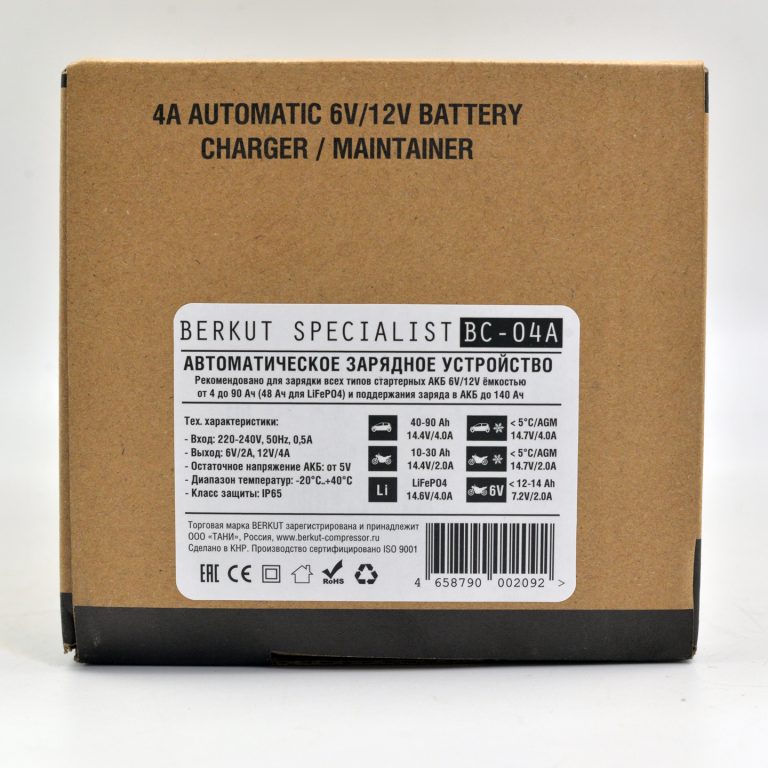 Зарядное устройство BERKUT BC-04A — полностью автоматическое устройство, предназначенное для обслуживания и зарядки 6 и 12-Вольтовых аккумуляторных батарей емкостью от 4 до 90 Ач, используемых в мото- и садовой техники и т.п. Устройство является полностью автоматическим и имеет поэтапный поэтапным алгоритмом зарядки в 9 стадий.